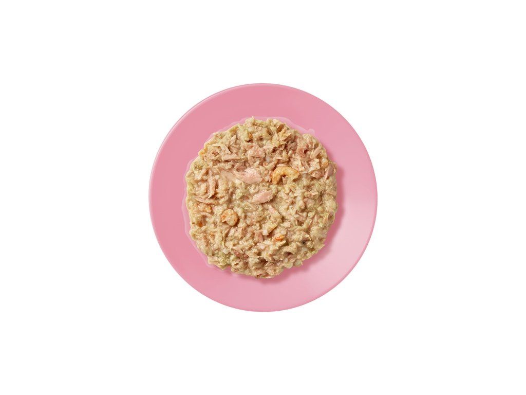 55 % tuňák, rybí vývar, 20 % krevety, rýže.