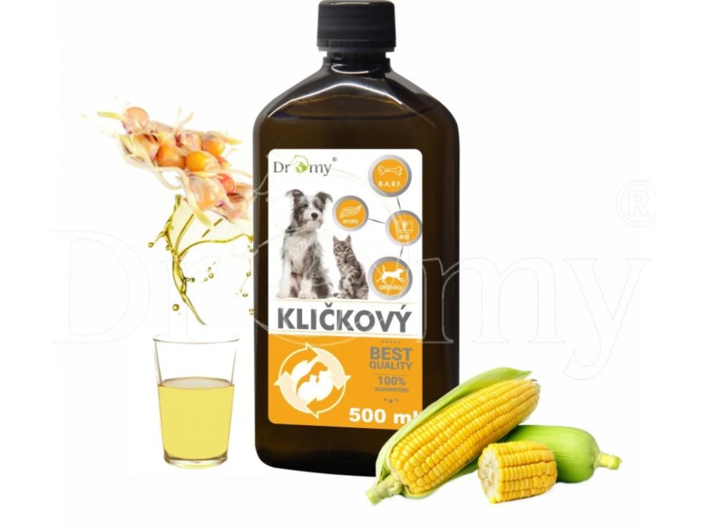 Jedno-druhový olej lisovaný za studena ze semen klíčků kukuřice, je pro psy a kočky zdrojem esenciálních mastných kyselin. V klíčících semenech dochází k vysokému nárůstu živin i zásaditosti. Každé klíčící semeno má v sobě výživnou energii pro růst celé rostliny obsah těchto látek je extrémně vysoký.  Kličkový olej přirozeně obsahuje vitamin E, který patří mezi nejdůležitější antioxidanty. V organismu chrání buňky před oxidačním stresem a účinky volných radikálů. Podporuje novotvorbu buněk, funkci kožní bariéry a chrání pokožku před dehydratací.