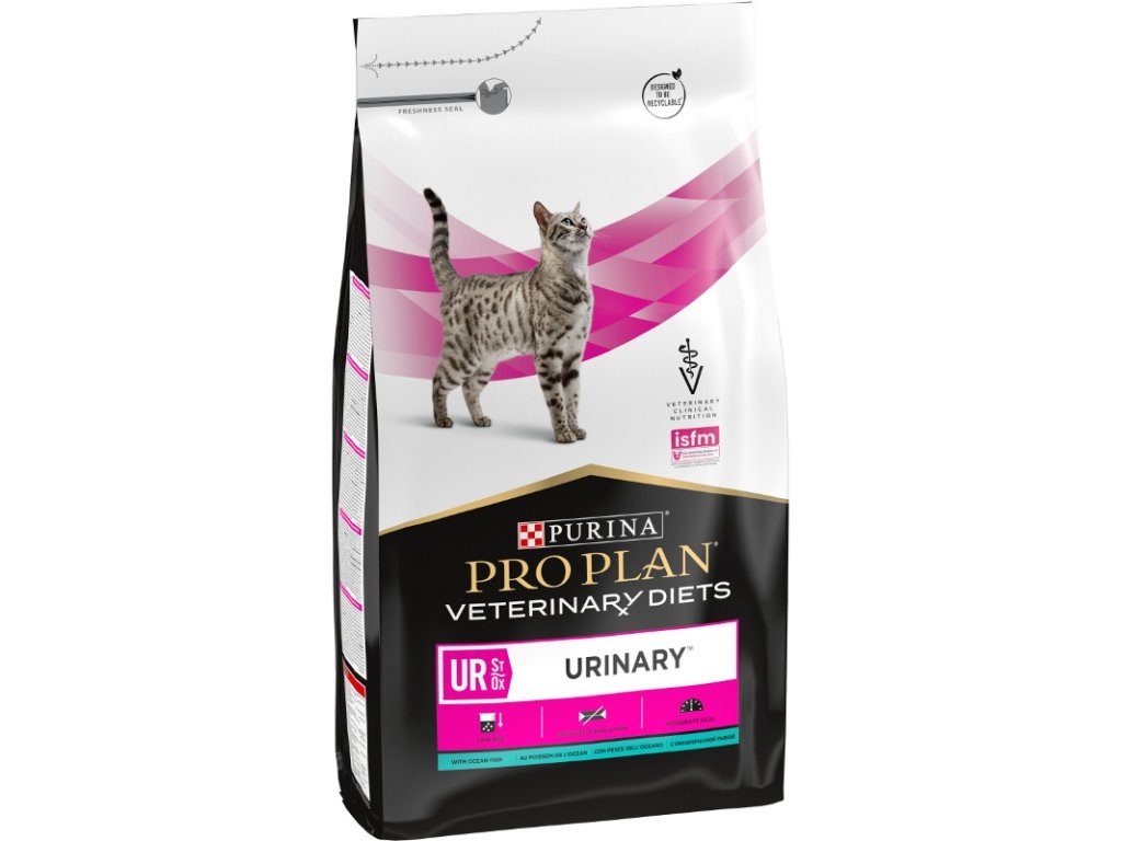 Feline UR St/Ox Urinary je speciálně vytvořeno pro podporu rozpouštění struvitových močových krystalů a kamenů, působí také preventivně proti vzniku/opětovnému výskytu struvitových kamenů a pomáhá redukovat opětovný výskyt oxalátových kamenů. Receptura může také pomoci při nutričním managementu idiopatické cystitidy u koček, a to díky podpoře příjmu vody a následnému zvýšení produkce moči. Feline UR St/Ox Urinary obsahuje živiny, jako jsou omega-3 mastné kyseliny a přírodní zdroj glykosaminoglykanů, které podporují zdraví močových cest. Střední obsah tuků a kalorií pomáhá udržovat ideální tělesnou hmotnost, protože obezita je rizikovým faktorem pro vznik FLUTD (onemocnění dolních močových cest u koček). Feline UR St/Ox Urinary není vhodné pro březí kočky, rostoucí koťata, kočky s chronickým onemocněním ledvin a kočky s onemocněním spojeným se zvýšenou diurézou nebo s retencí tekutin, jako jsou ascites a edém.