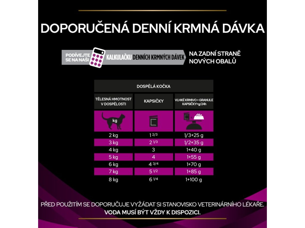 Doporučená doba používání pro rozpouštění struvitových kamenů je 5 až 12 týdnů; od počátku do 6 měsíců pro omezení jejich opakované tvorby. Před použitím nebo před prodloužením doby používání se doporučuje vyžádat si stanovisko veterinárního lékaře. Voda musí být vždy k dispozici. 1 kapsička = 20 g granulí Feline UR StOx Urinary™. Návody pro kombinované krmení jsou platné pouze pro současné podávání suchého a vlhkého krmiva Feline UR StOx Urinary™. Kočky s hmotností nad 6 kg: na každý další kg tělesné hmotnosti navyšte denní krmnou dávku o 3/4 kapsičky nebo o 15 g granulí.